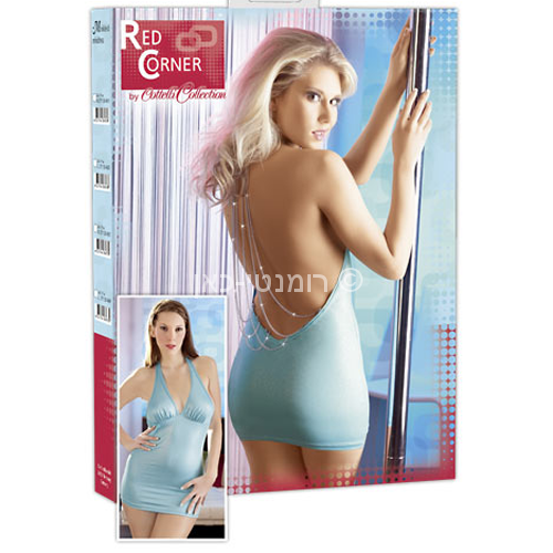 גב חשוף עם שרשראות עדינות ומבריקות בגב.